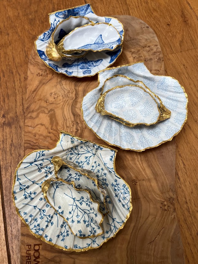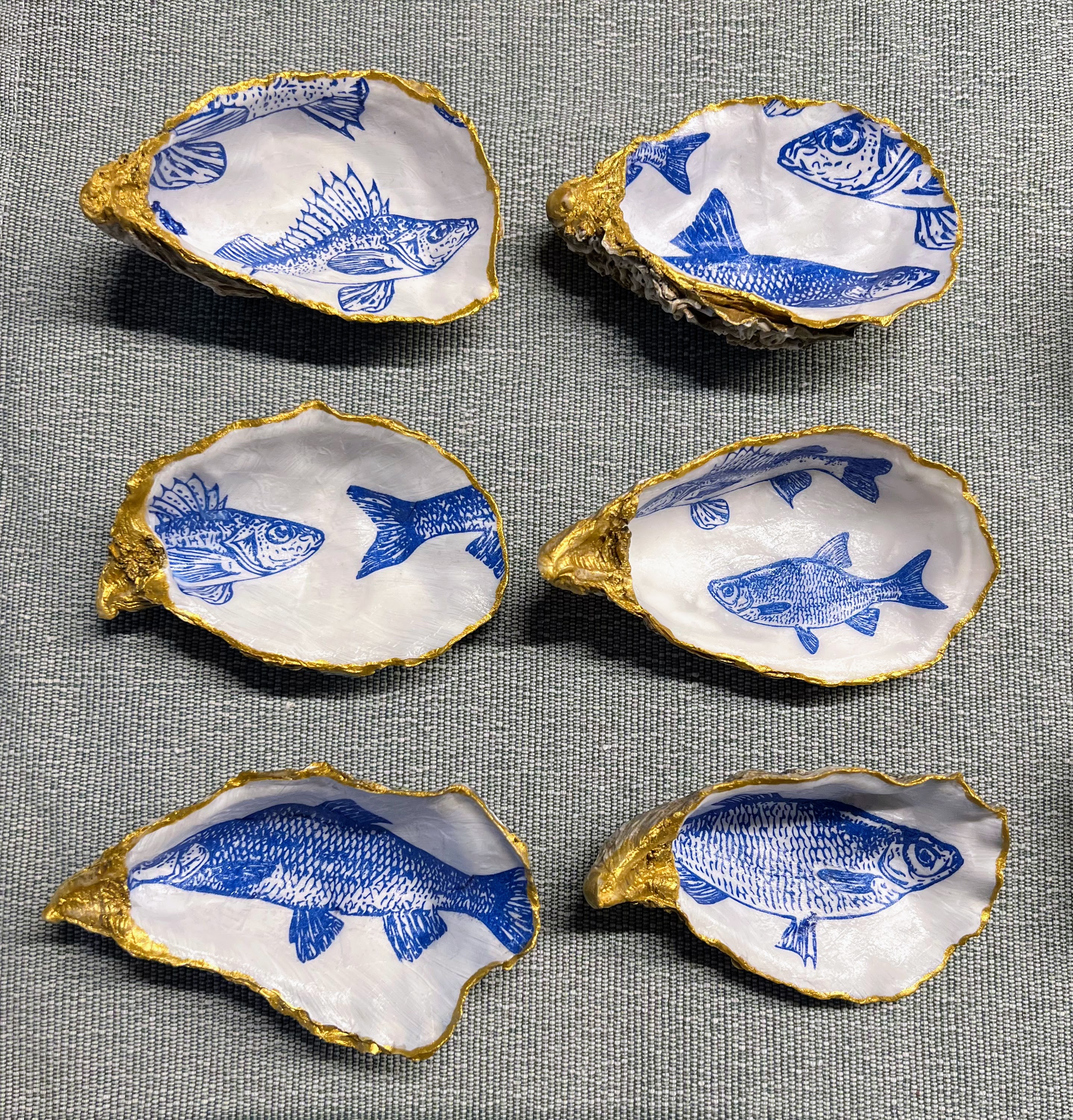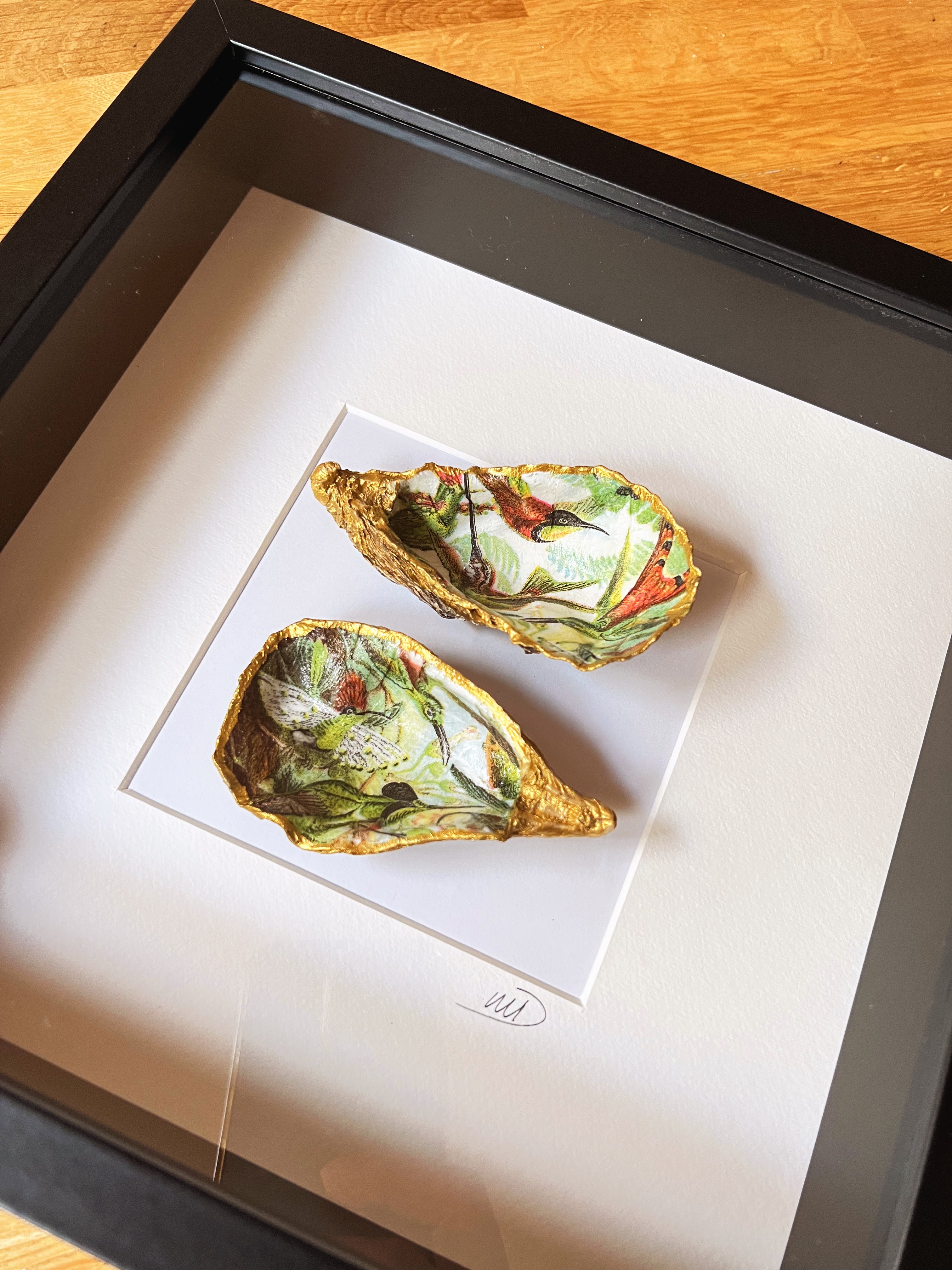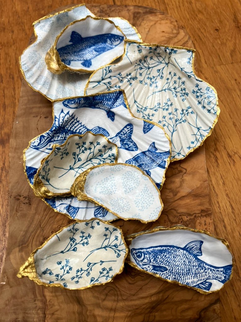 Alle combinaties zijn mogelijk en zie je een dessin op een oester dat je graag op een coquille wilt of andersom: laat het me weten, dan maak ik het. Levertijd is een paar werkdagen of in overleg.