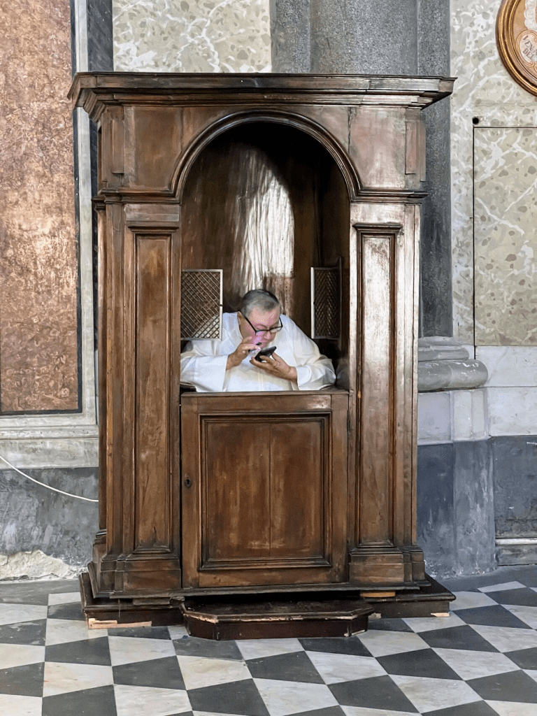 In de ‘Duomo di San Gennaro’ zagen we deze priester in een biechtstoel, verdiept in zijn telefoon. Heilig en alledaags in één beeld. Het typeert Napels: traditie en vernieuwing bestaan er ogenschijnlijk moeiteloos naast elkaar.