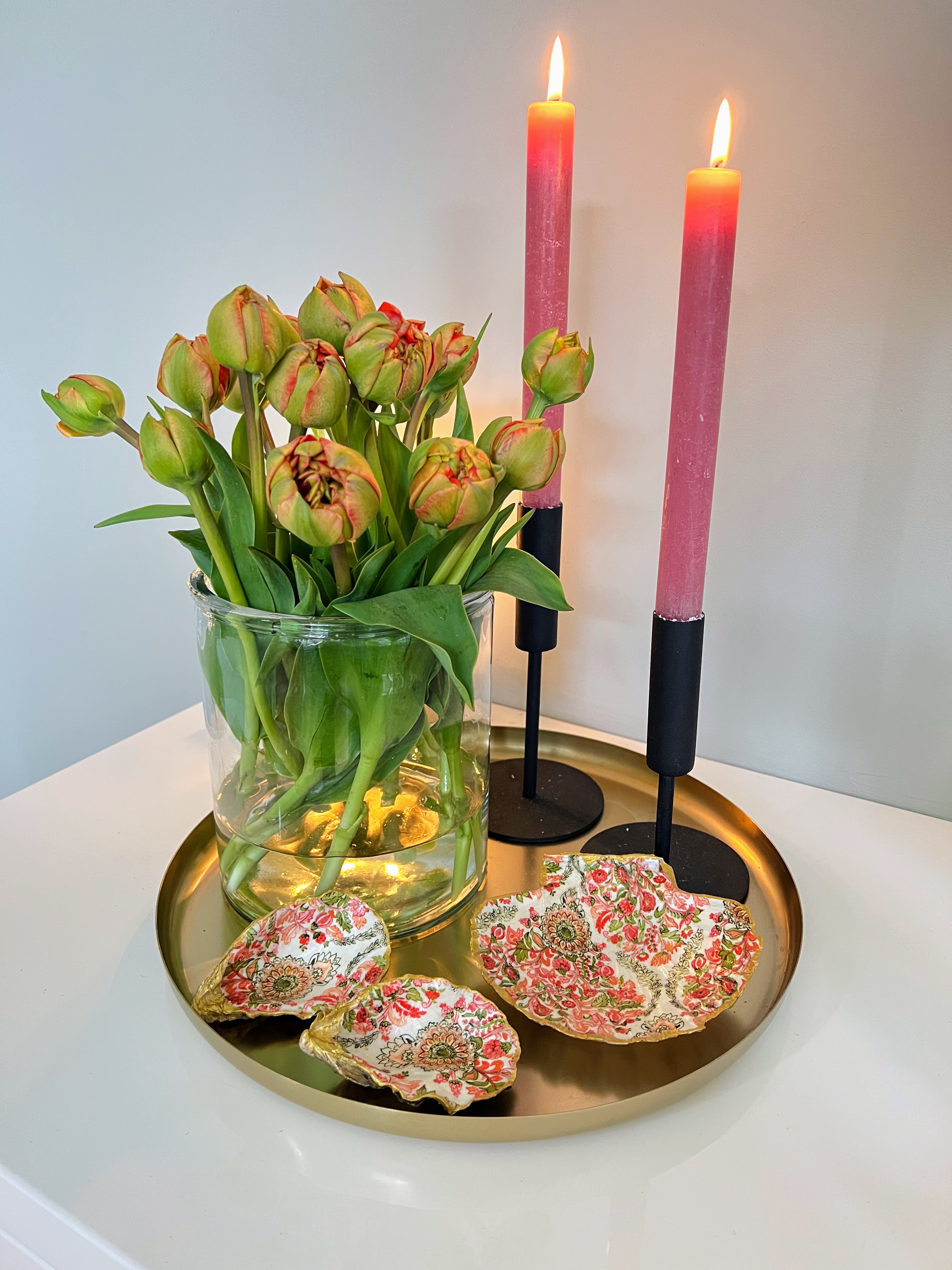 Gebruik ze om toastjes of nootjes op te leggen bij de borrel, als decoratie op het bord tijdens je kerstdiner of om bijvoorbeeld roomboter op te serveren en leg er chocolaatjes of bonbons op voor bij de koffie. Ook je sieraden kun je er heel mooi op bewaren.