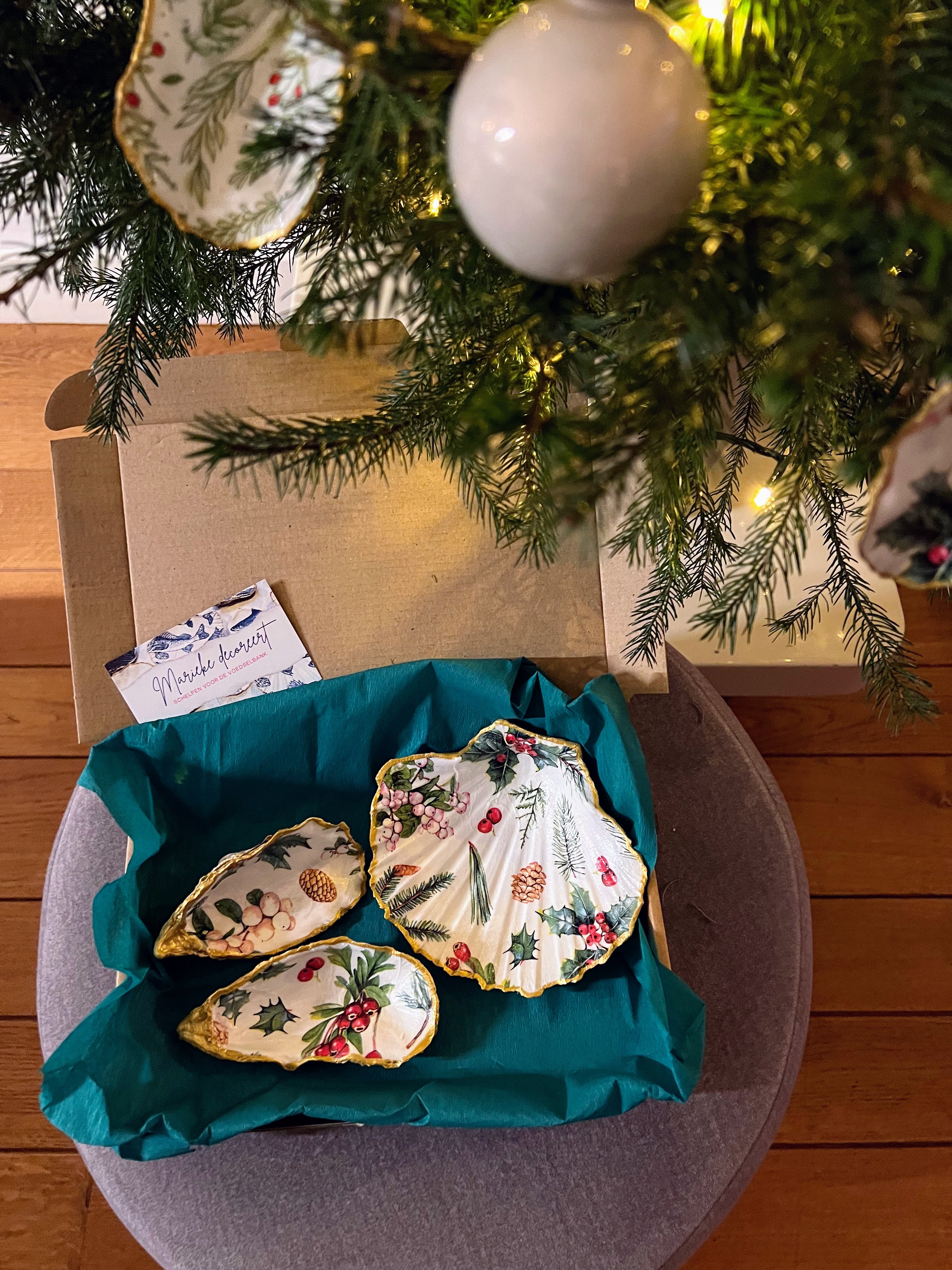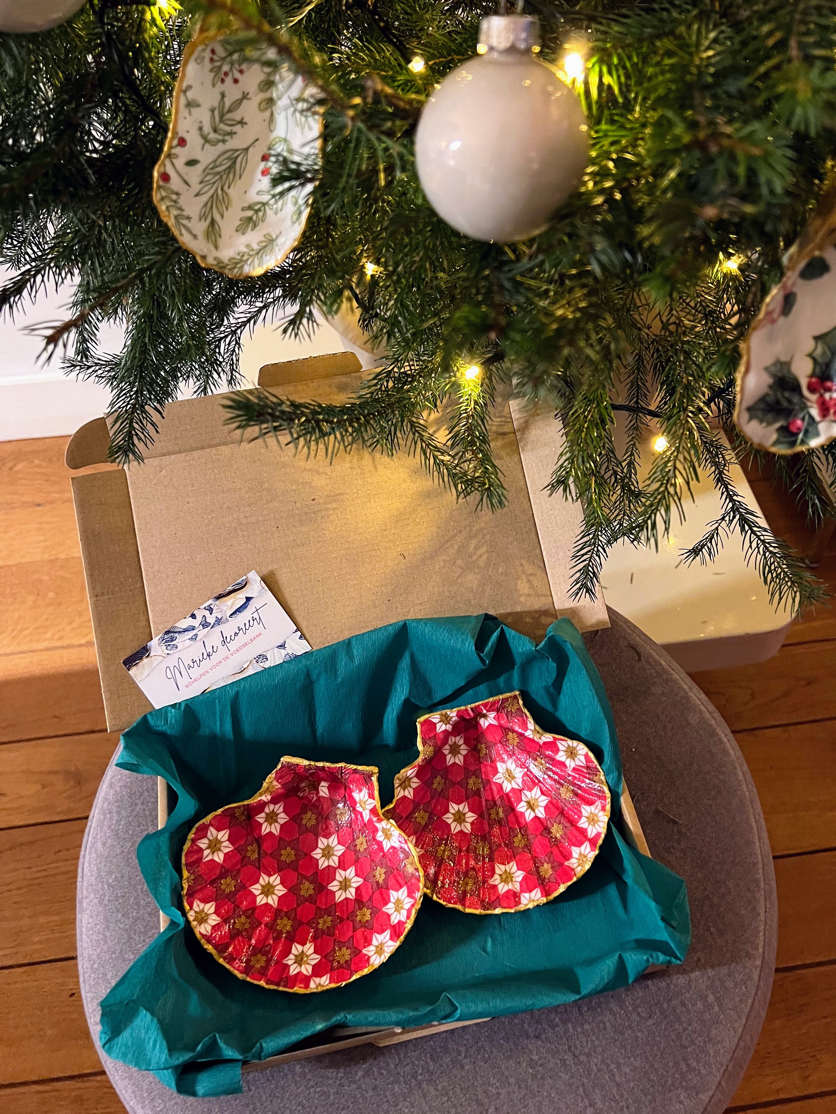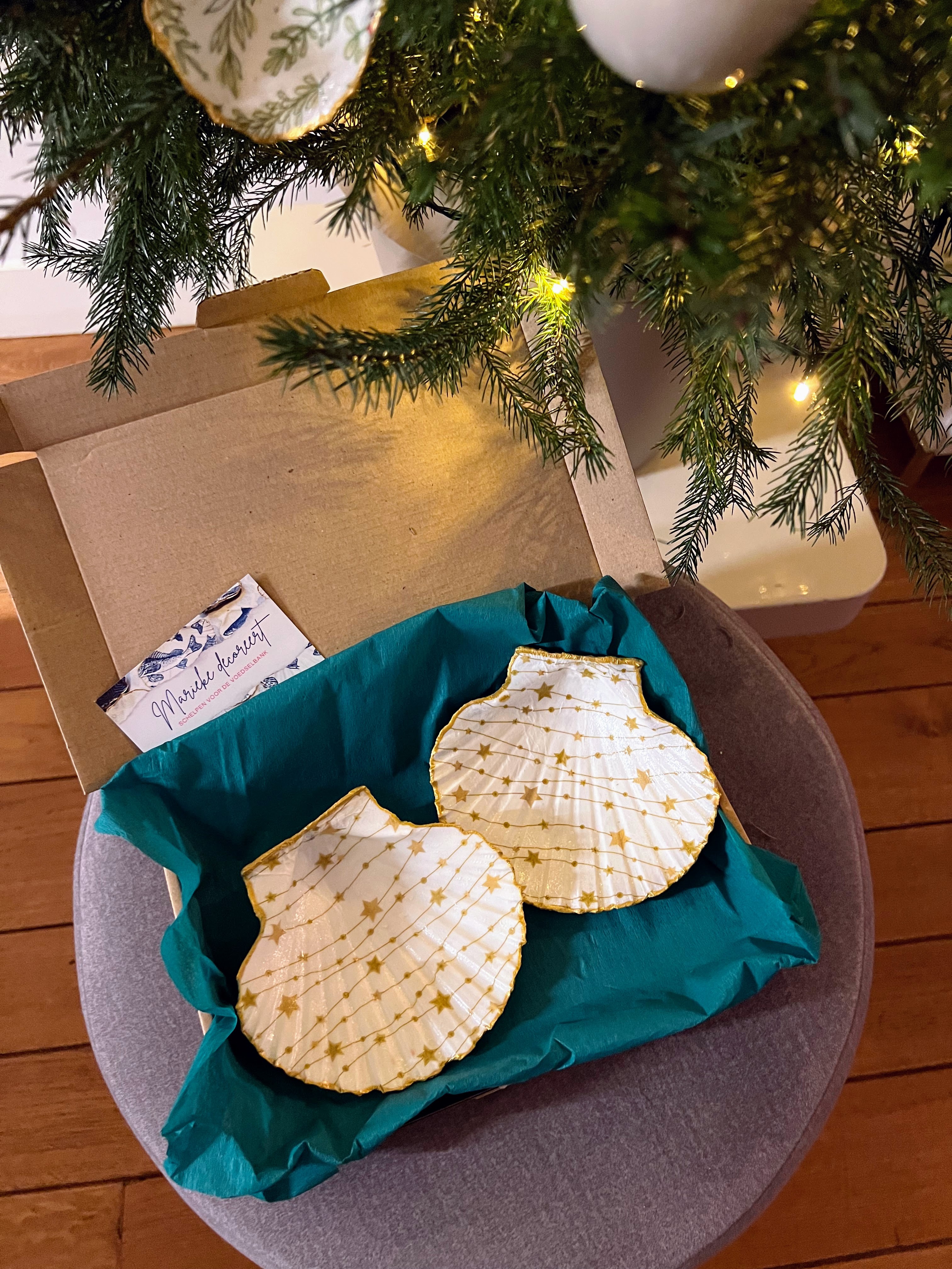 Kerstkadoosje set 2 oesters – 1 coquille: 25 euro / Kerstkadoosje set 2 coquilles: 20 euro