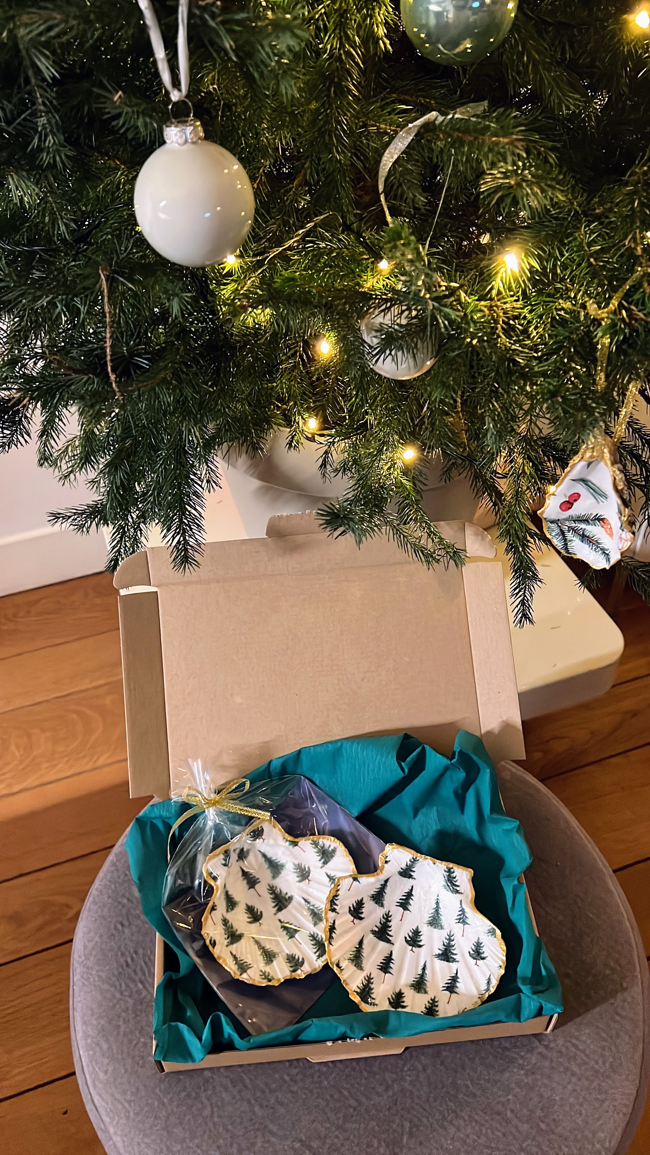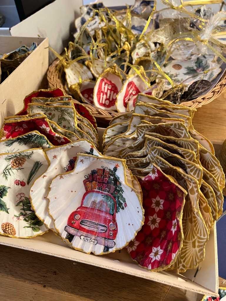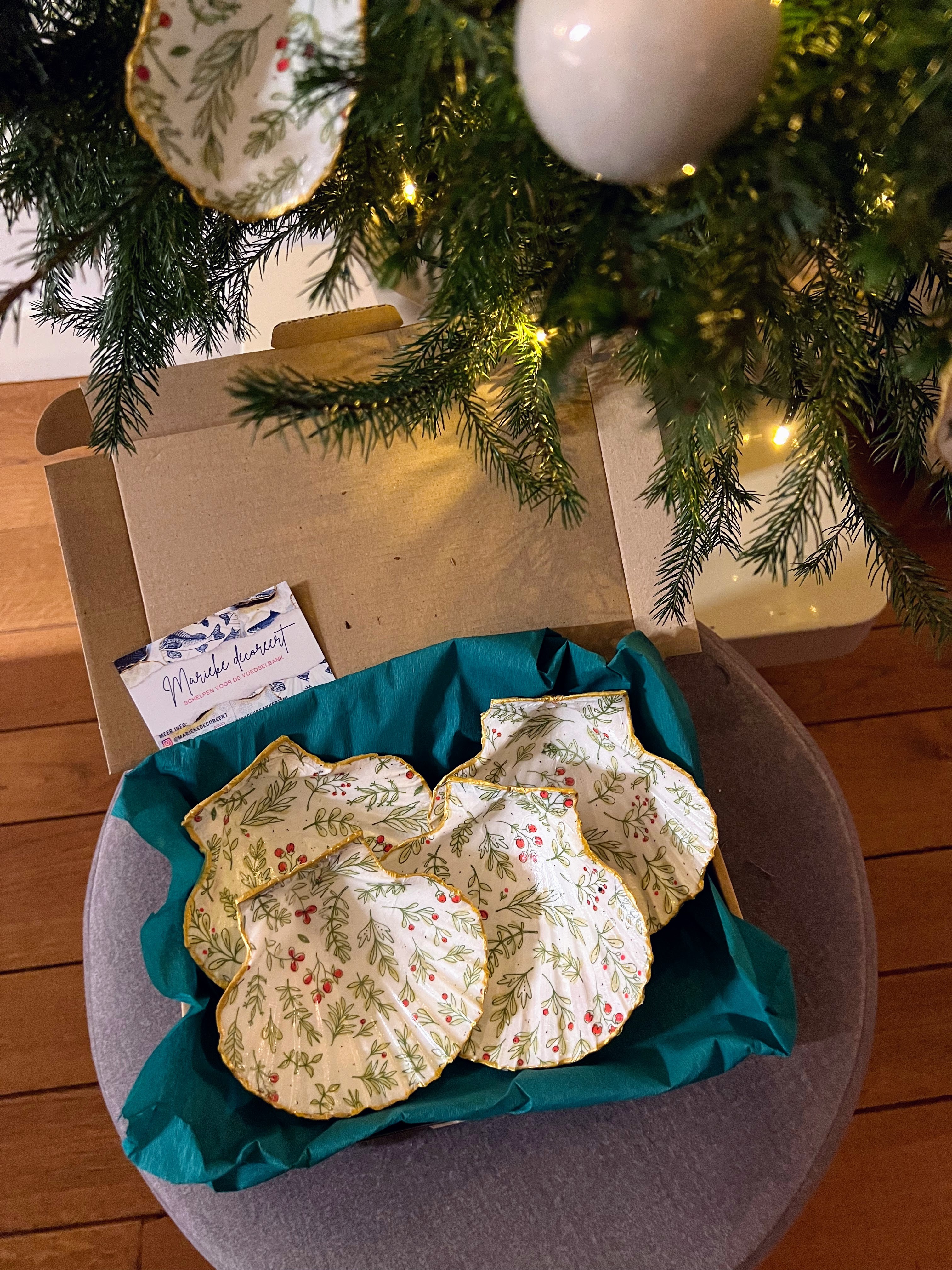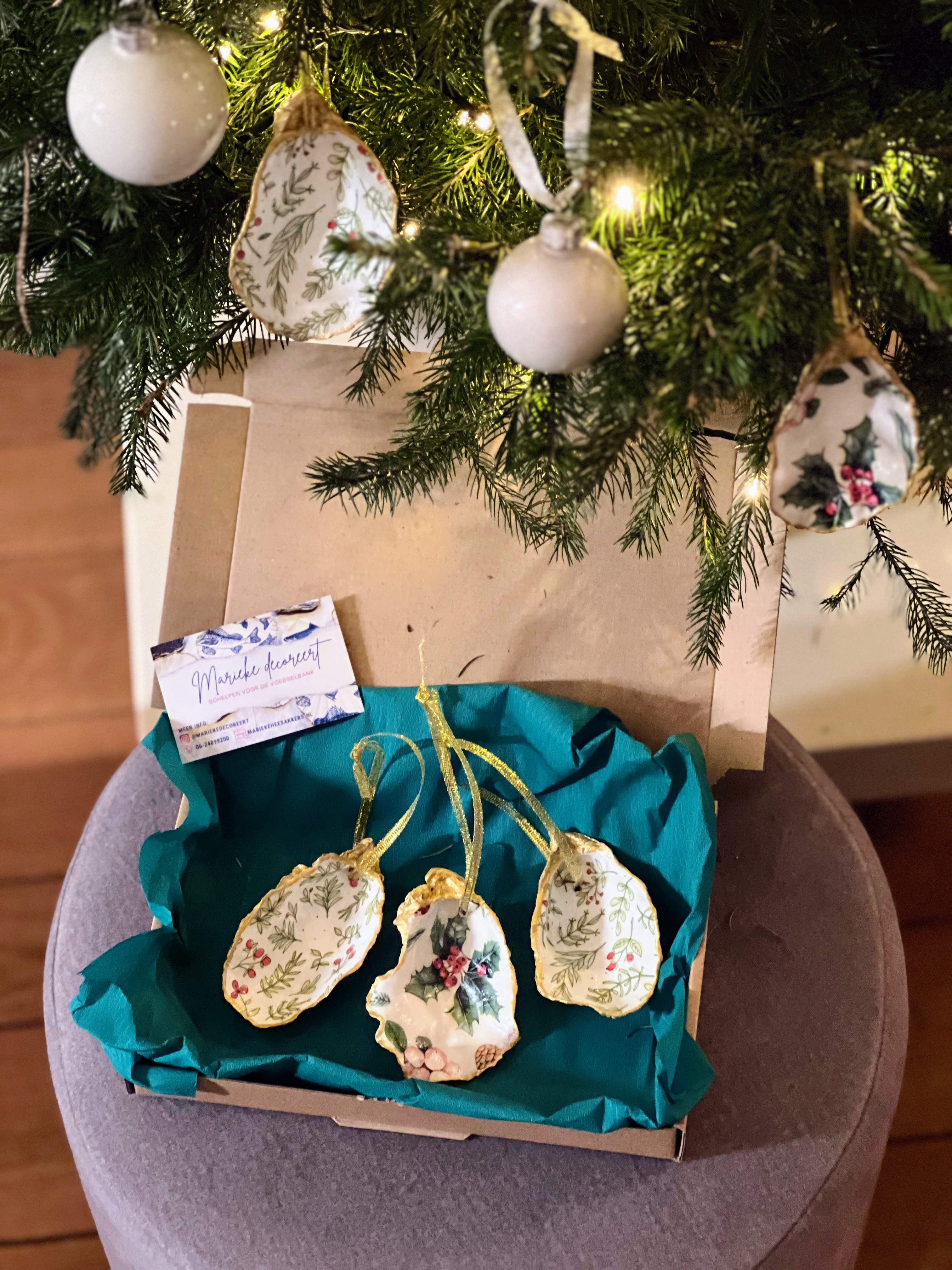 Kerstkadoosje met set van 3 kersthangers: 25 euro / Kerstkadoosje met set van 4 kerstcoquilles: 35 euro